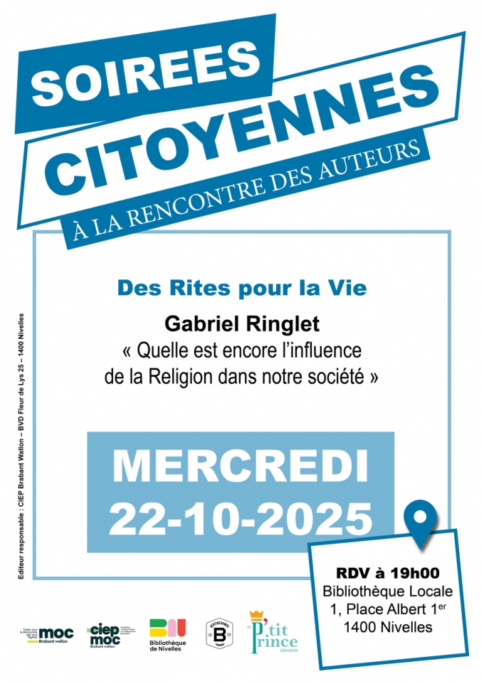 La bibliothèque vous invite à une nouvelle soirée citoyenne en compagnie de Gabriel Ringlet, écrivain, poète et théologien. À travers son ouvrage Des rites pour la vie, il nous propose une réflexion profonde sur les gestes symboliques qui accompagnent nos existences.