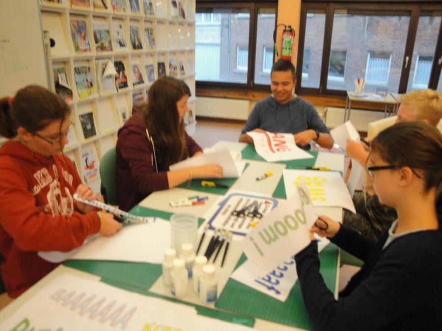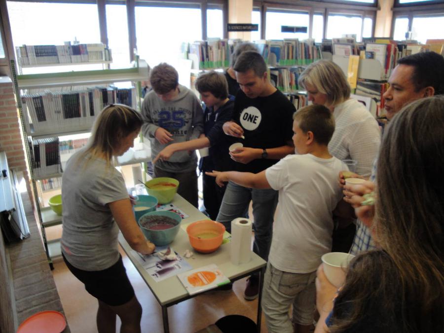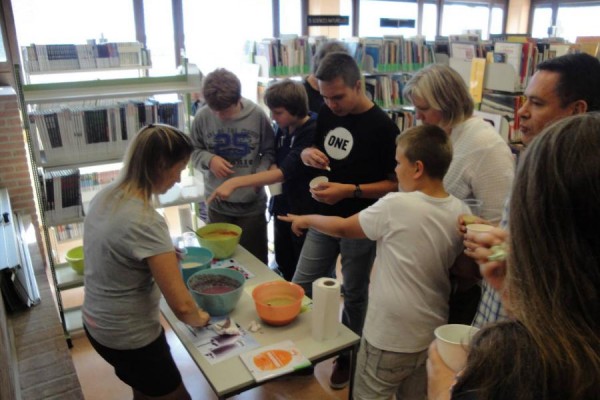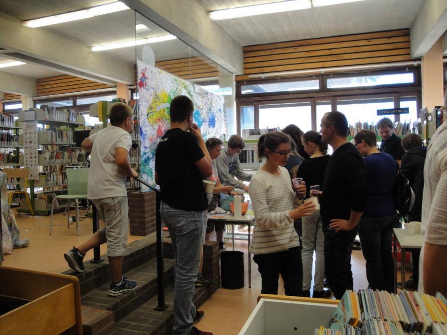 Tout fut mis en œuvre pour favoriser la bonne entente et, surtout, pour atteindre l'objectif final du stage : décorer l'espace BD jeunesse de la bibliothèque à l'aide des réalisations des adolescents. Le 5 août à 16h00, les parents et le public extérieur furent invités au vernissage de ce "nouvel" espace BD. Ils ont ainsi pu admirer les œuvres réalisées lors du stage mais aussi déguster de délicieux smoothies et "pop corn colorés" cuisinés le matin même. S'il ne reste plus rien de ces préparations culinaires, vous pouvez toujours admirer les tableaux, fresques et sculptures réalisés par les jeunes. Pour ce faire, il suffit de vous rendre dans l'espace BD jeunesse de la bibliothèque !